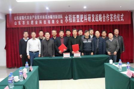 会上山东省现代农业产业技术体系水稻创新团队与山东农大肥业科技有限公司签定了战略合作协议,今后在水稻免追肥及减肥增效方面积极开展联合工作。