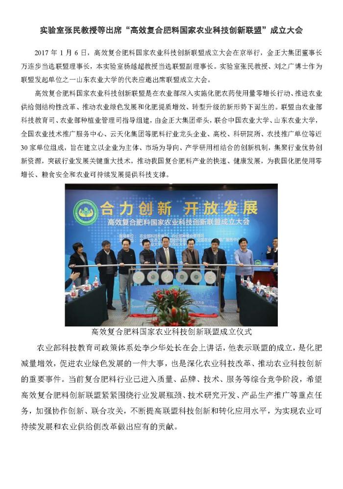 实验室张民教授等出席“高效复合肥料国家农业科技创新联盟”成立大会